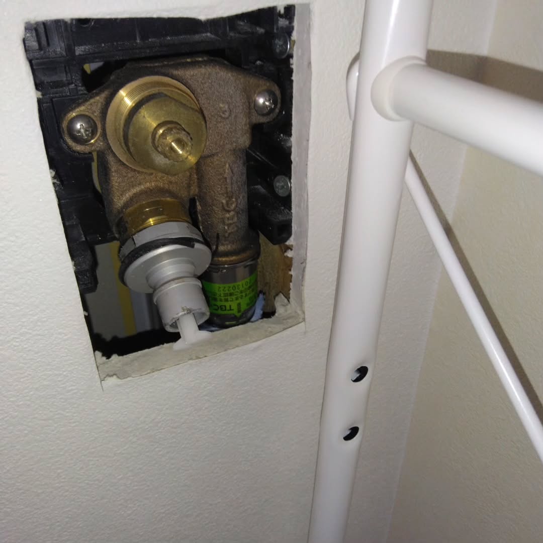 この度はタブチ製水栓コンセントのホース接続部水漏れでした。水栓本体にはTBCとメーカーロゴが記載されております。所謂埋込型の洗濯水栓ですが、お引っ越しされて入居初日に洗濯機を使用したら水漏れしたとの事でした。