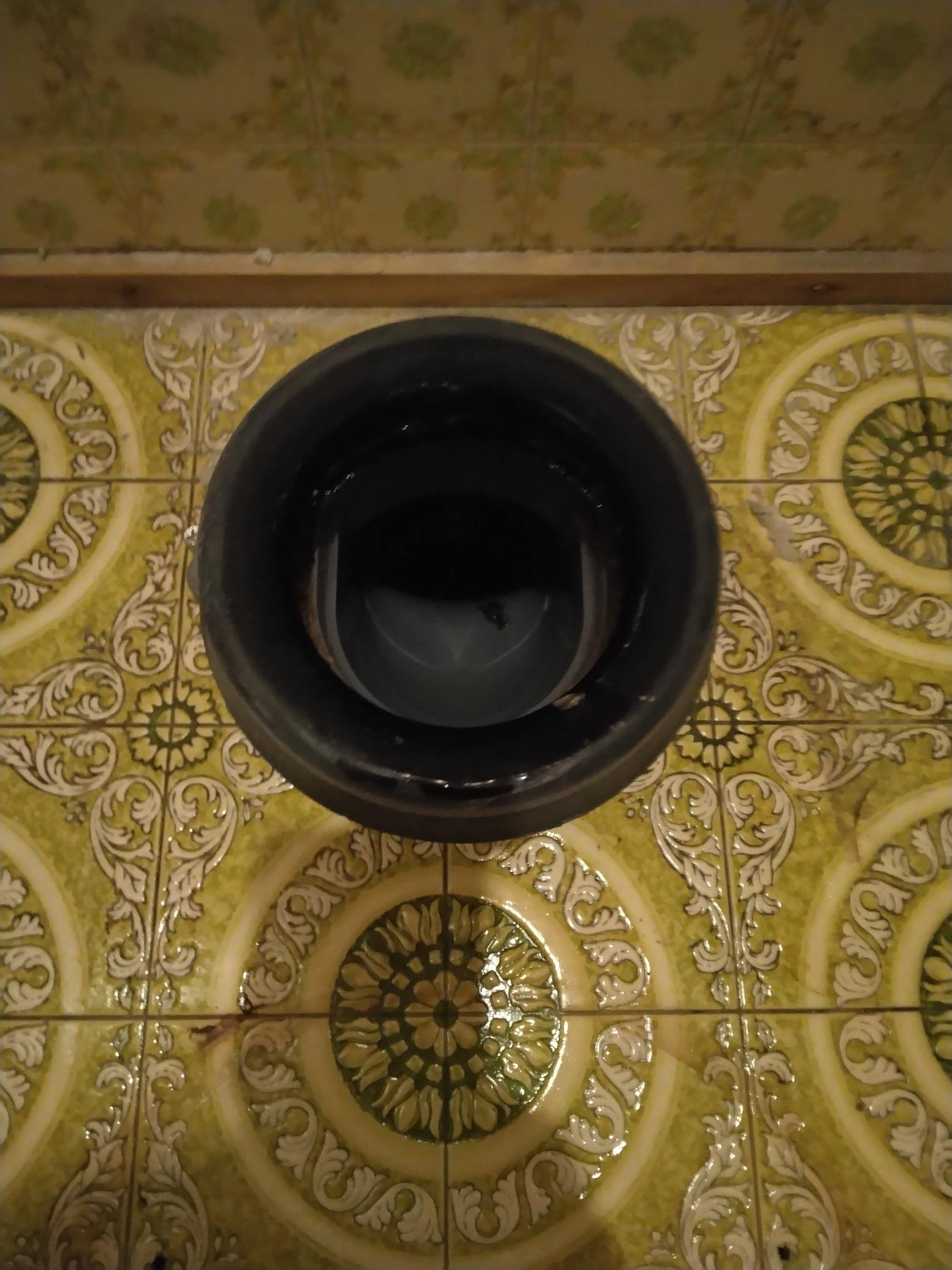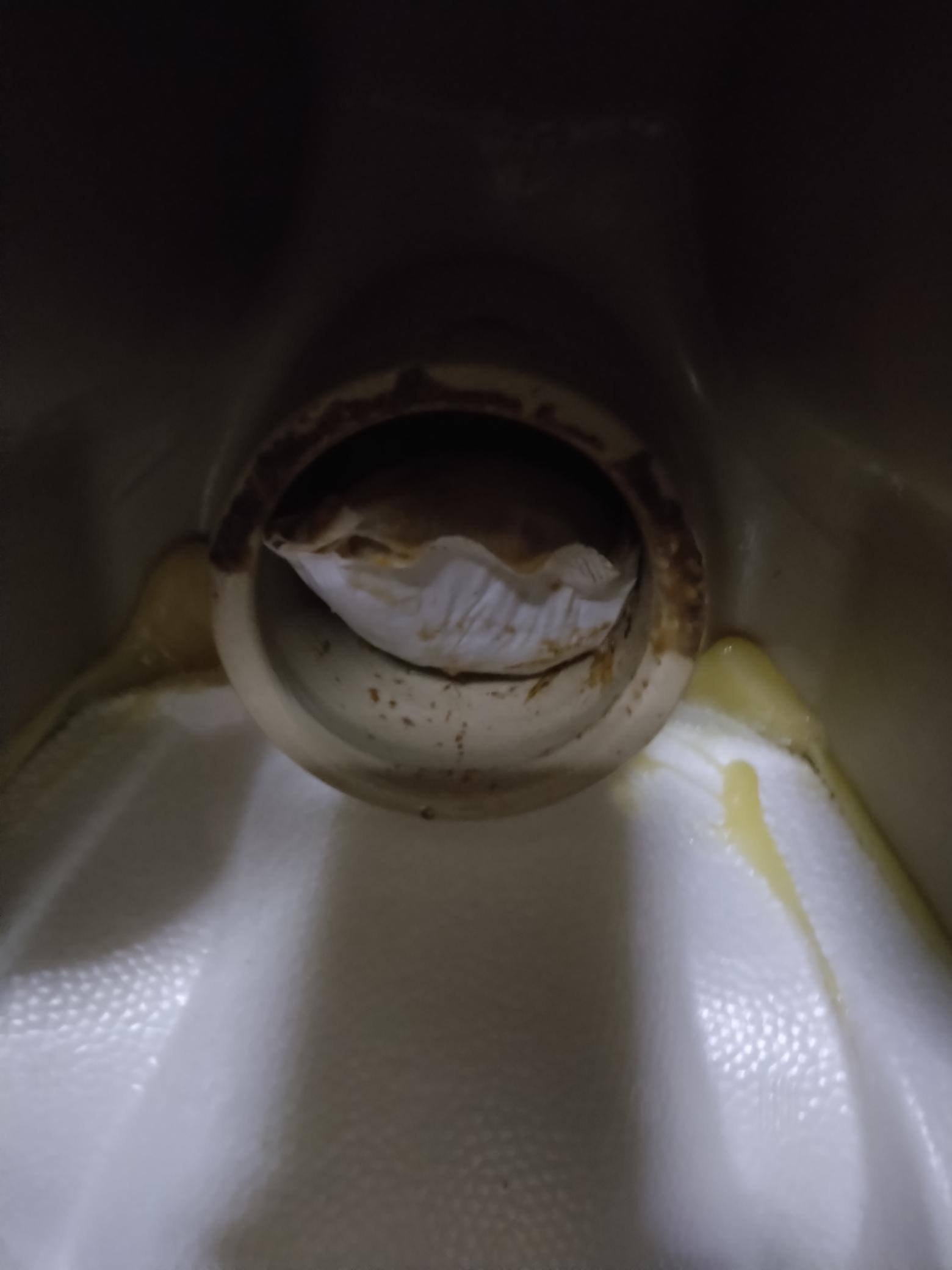 トイレを外してみると、床と便器を接続するためのソケットがありますがそこには何も無く、ソケットから排水管にバケツで水を流すと問題なく流れるのを確認、その後外した便器を裏返してみると丁度最後の出口の部分に、パットの様な物が挟まっているのを確認したので引っこ抜いて除去をしました。