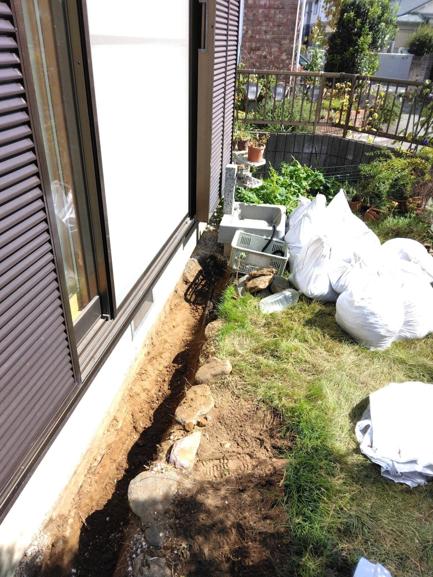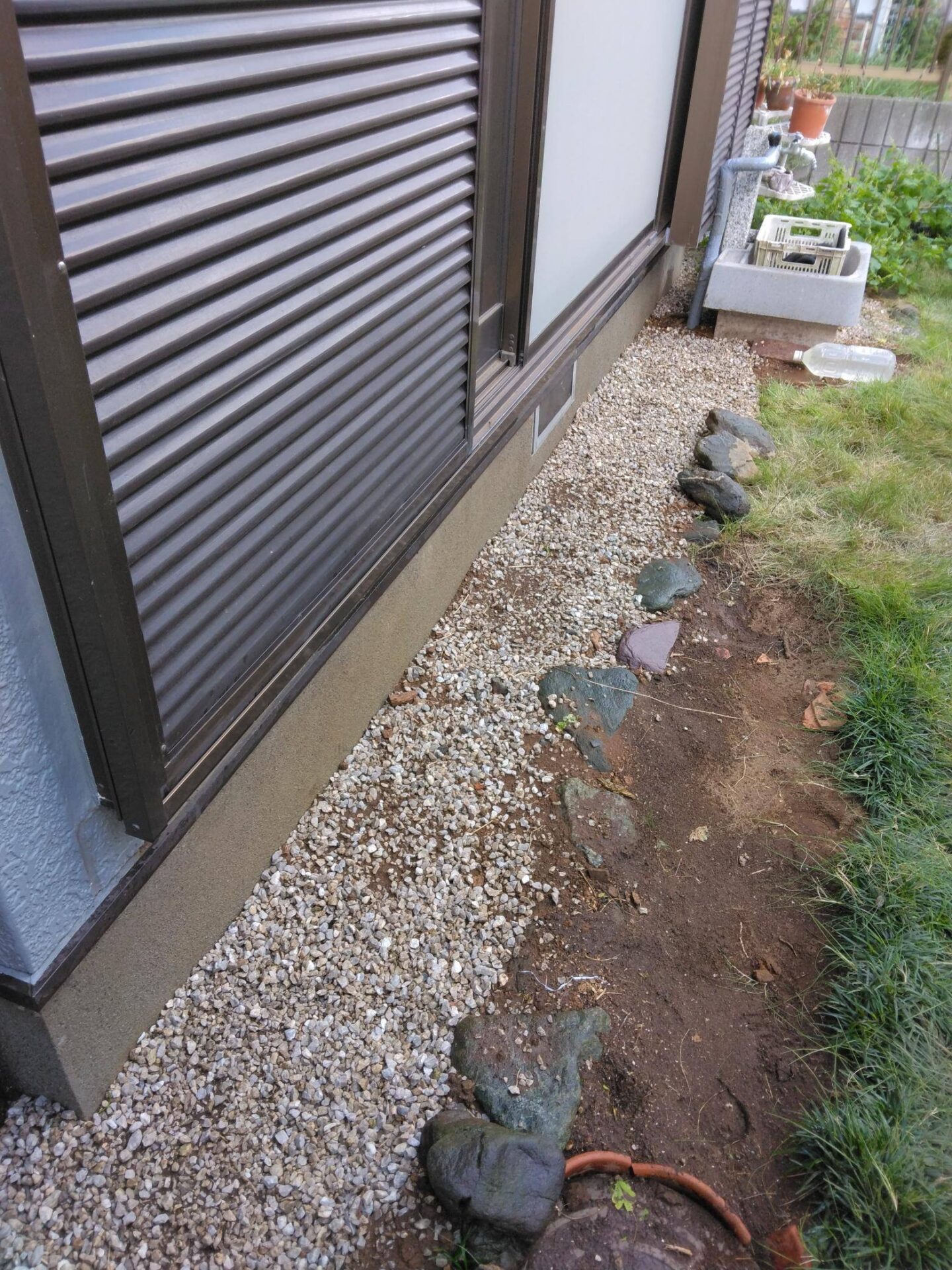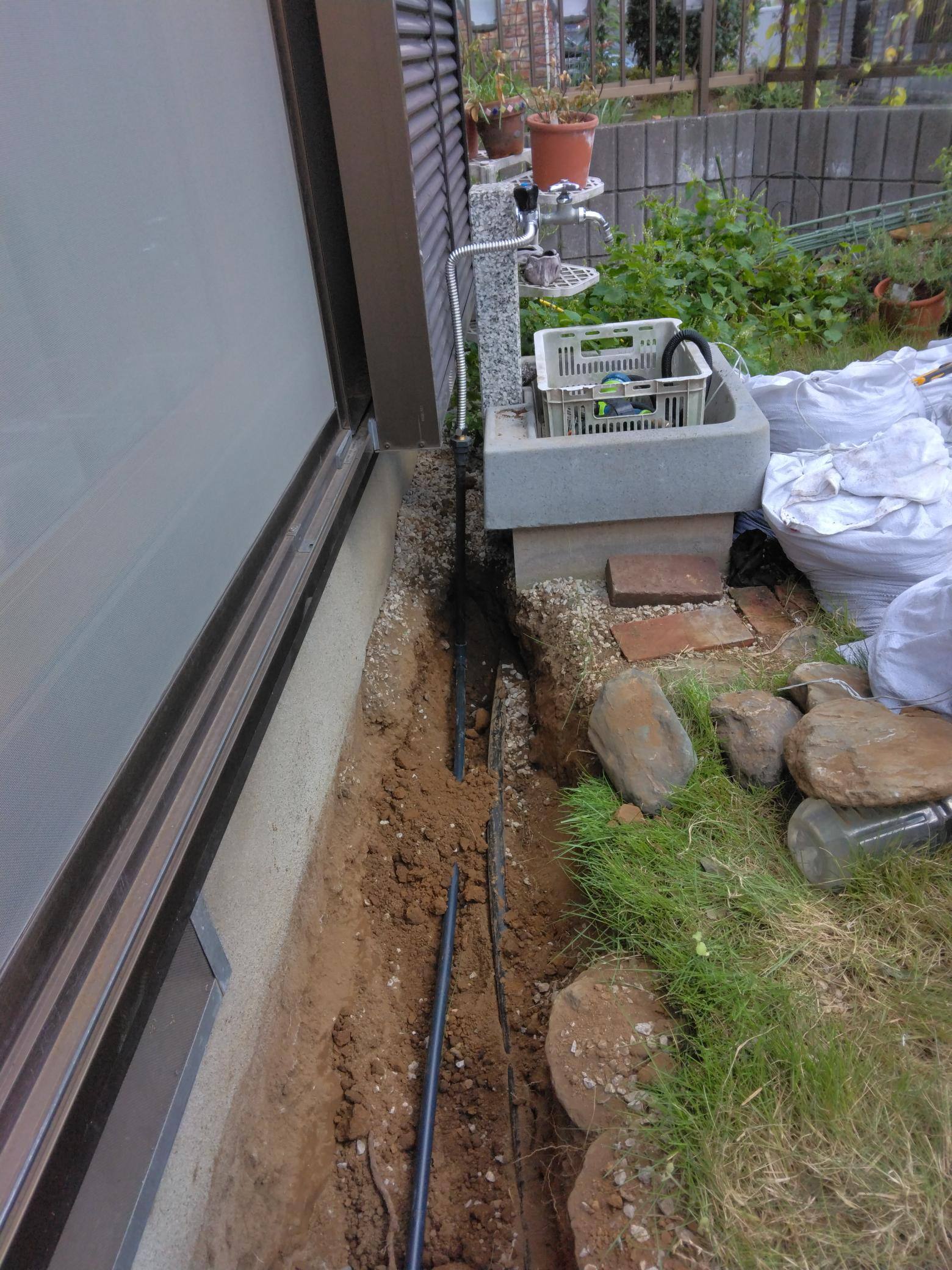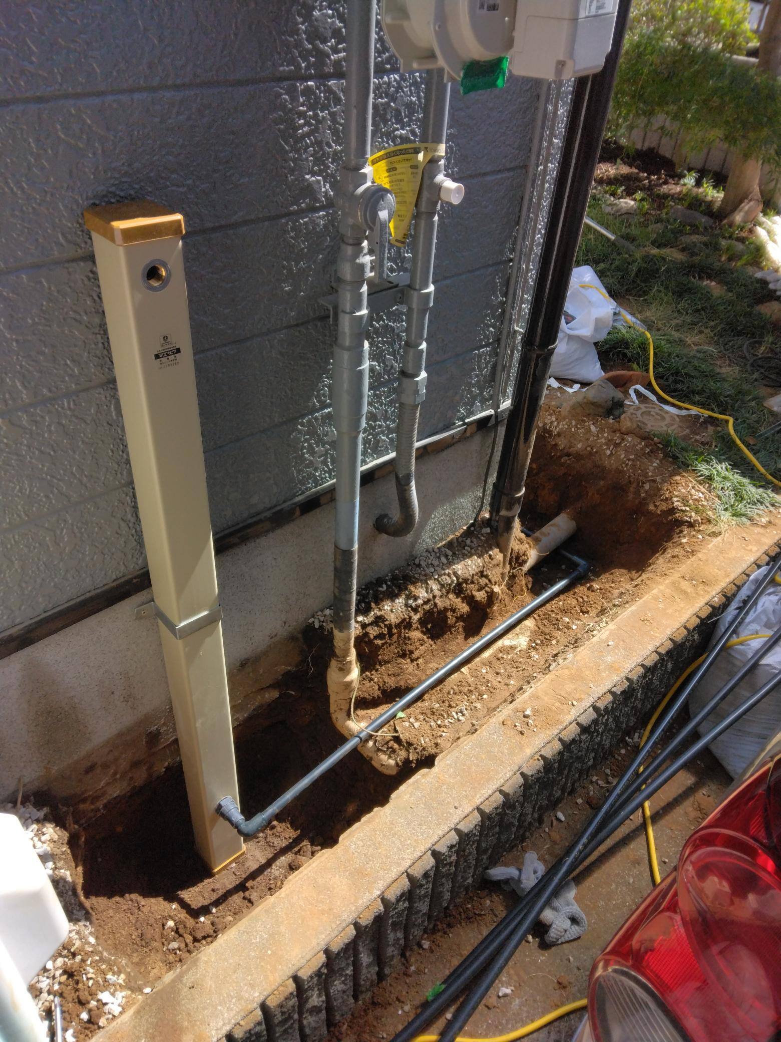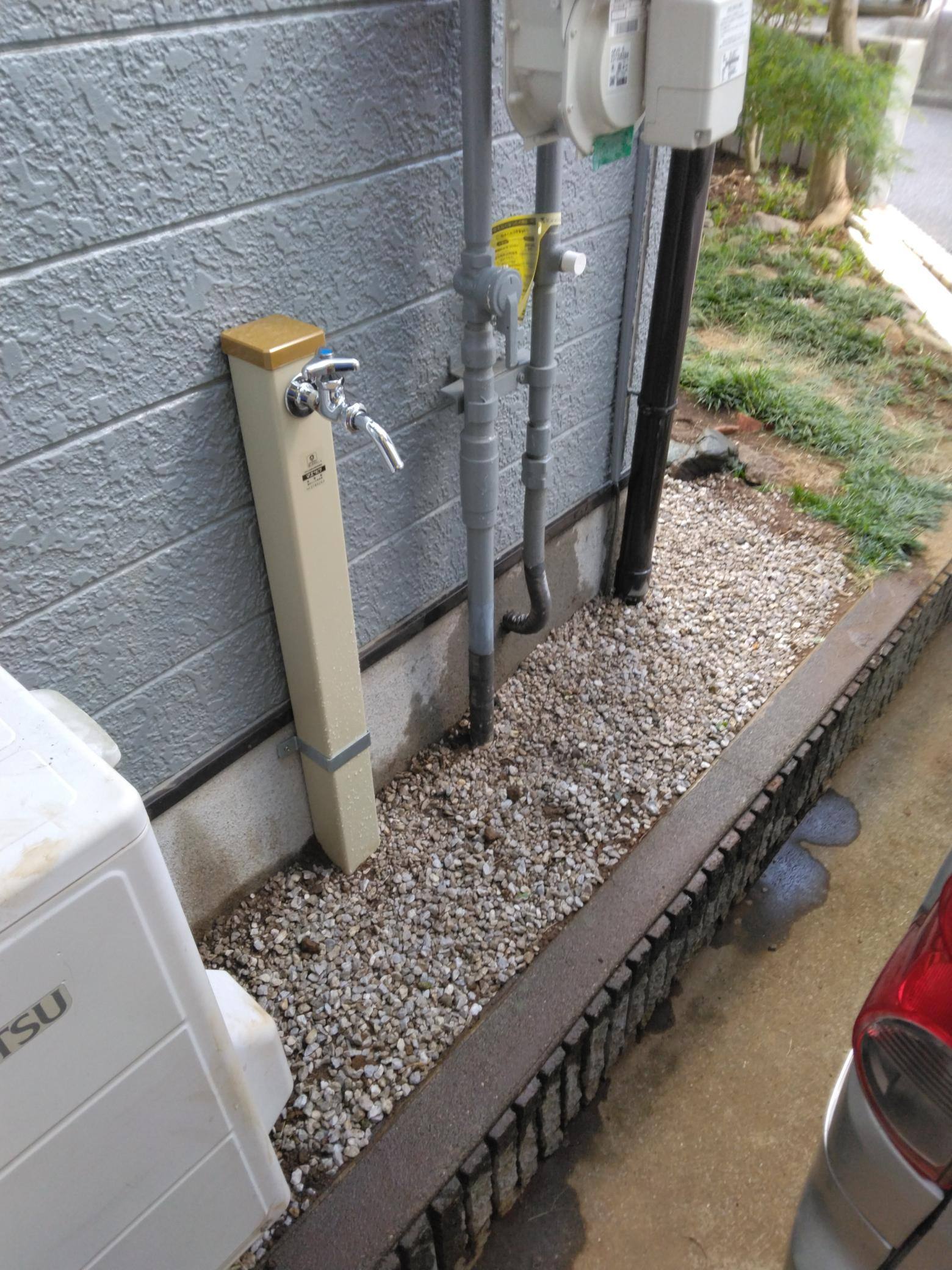 現在も、お庭には花の水やりなどに使われている屋外水栓が あるので、そこから水道を分岐させて建物の基礎に沿う形で 水道管を新設し、駐車場横まで延長をさせて水栓柱を立てる工事を行いました。