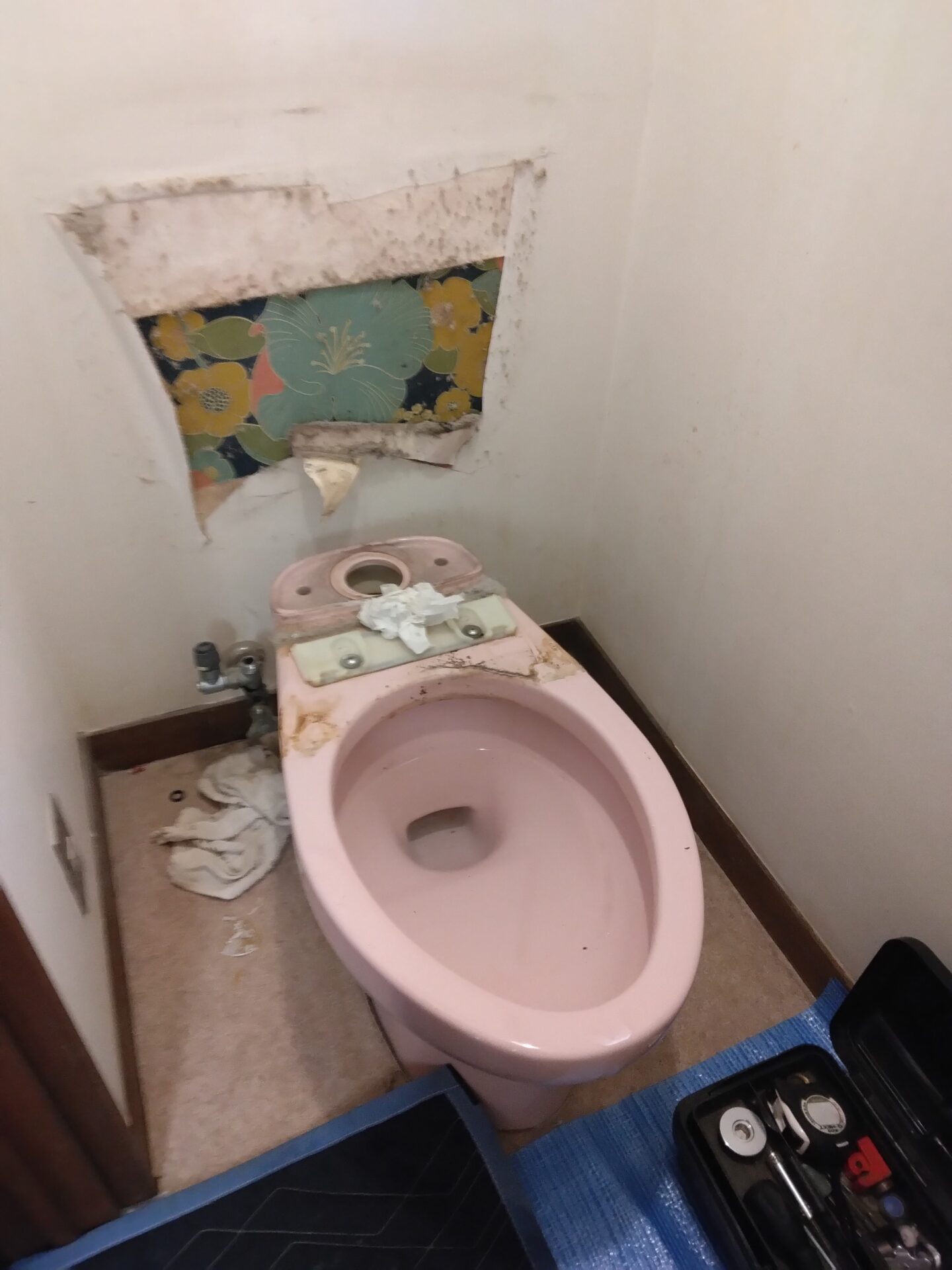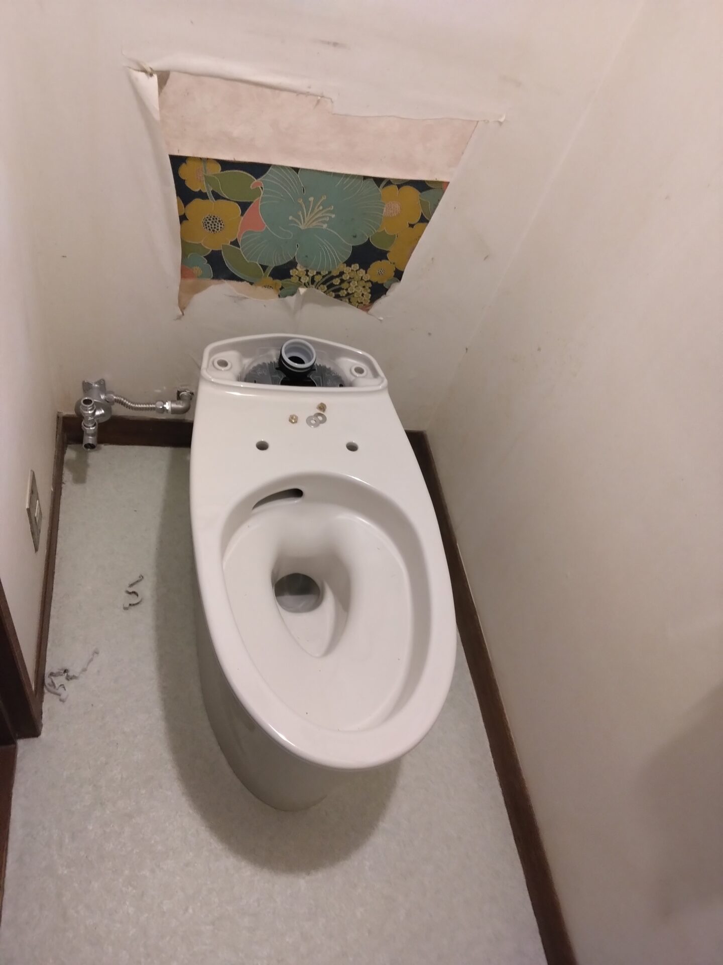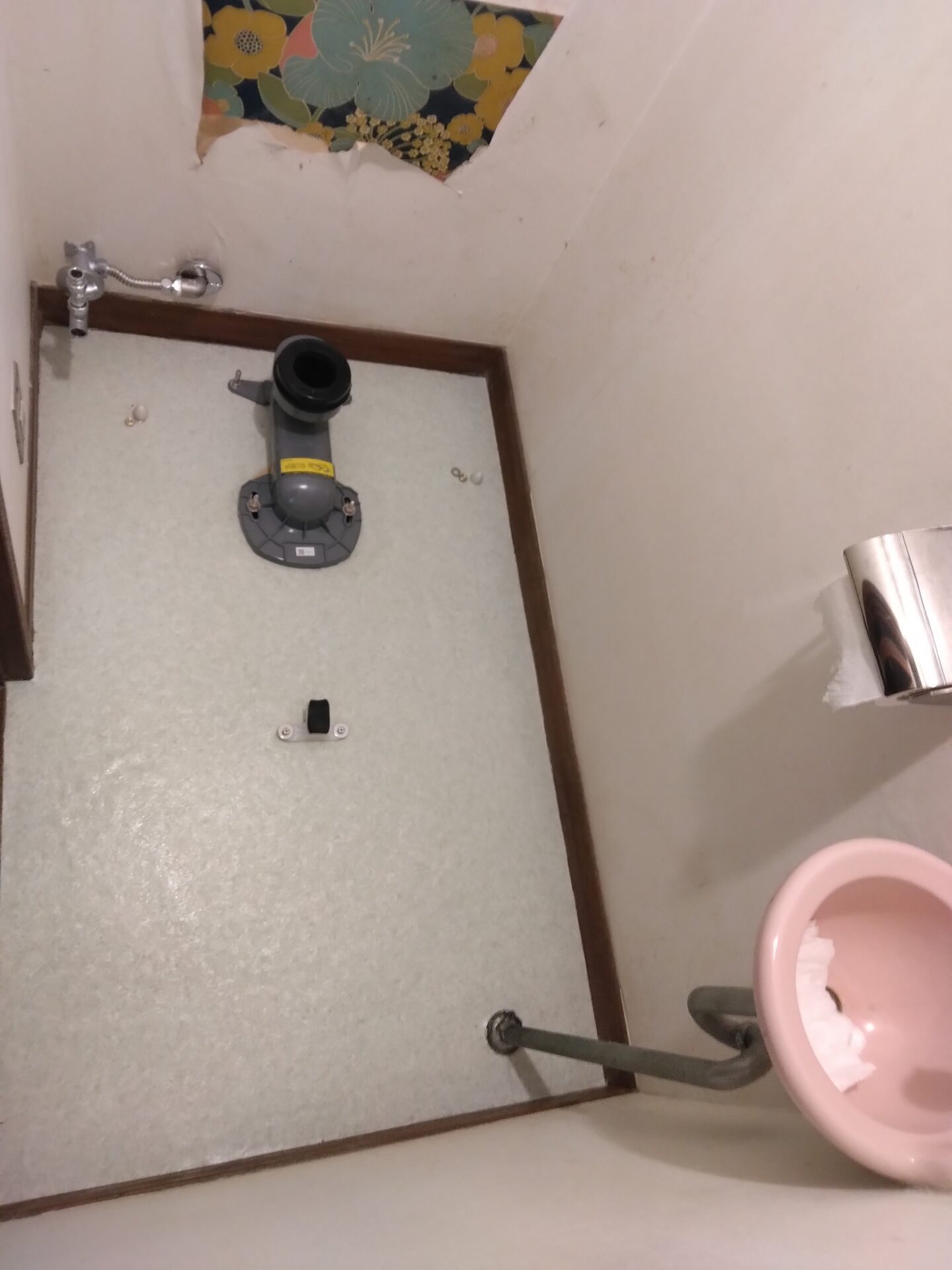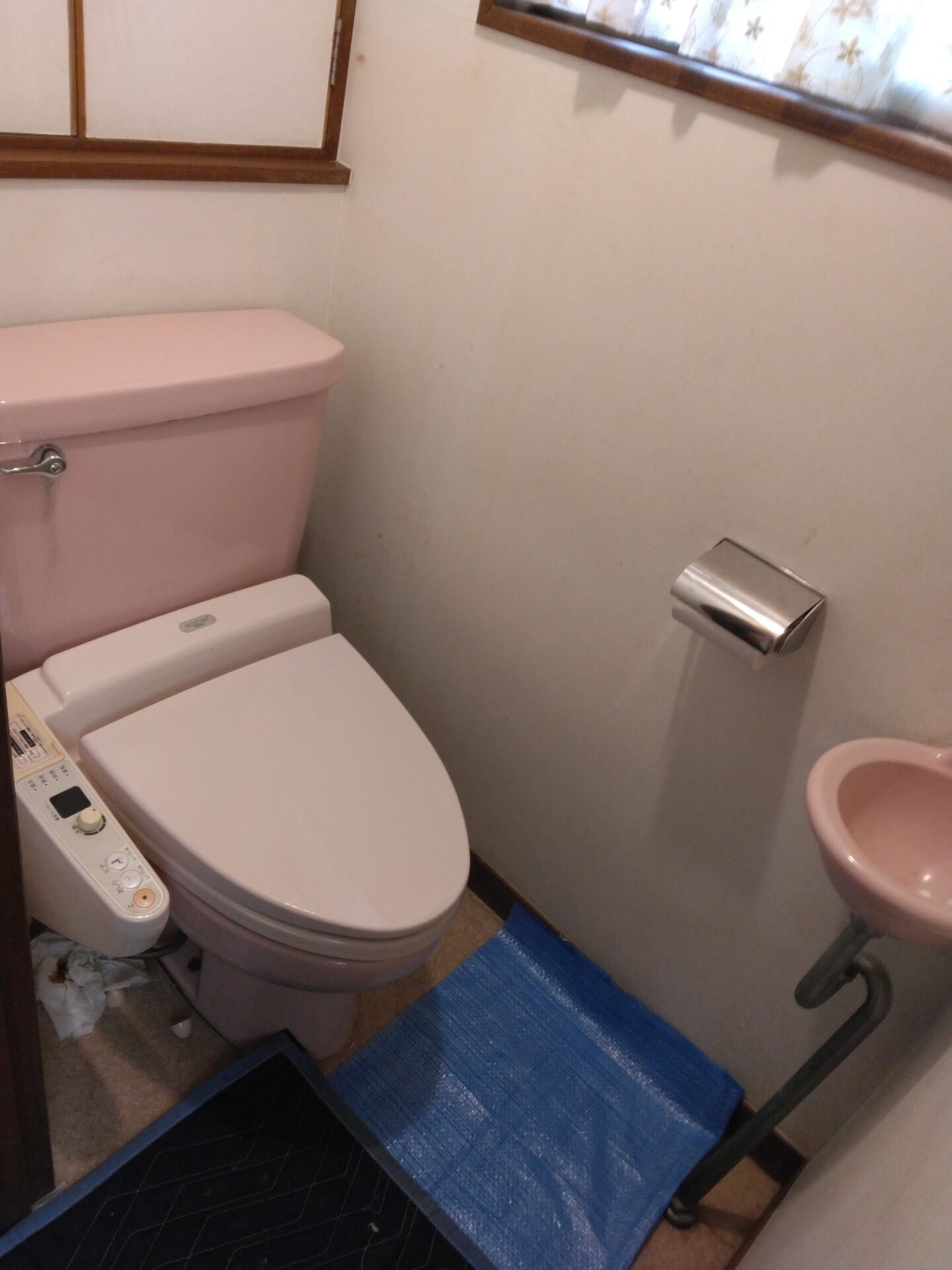 お客様からもそろそろリフォームを検討していらっしゃったという事で、今回は便器・タンク・ウォシュレット、と床のクッションフロアの貼り替えを含めた工事を行う事となりました。