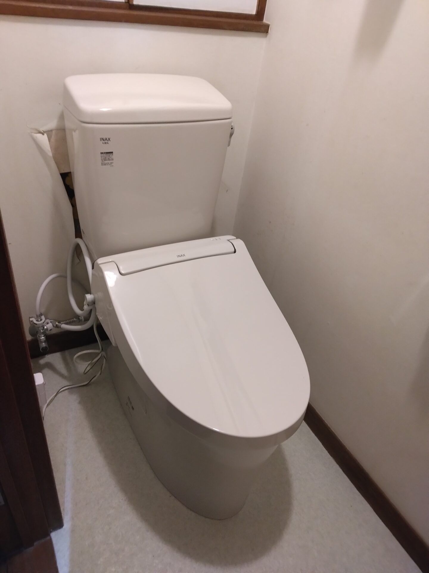 クッションフロアの張替えを行ったので作業時間は大体半日ほどかかりましたが、おトイレの床から本体、ウォシュレットは袖付きリモコンから壁付きのリモコンに変えた分、トイレの奥の掃除もし易くなったとお客様も大変お喜びになられていました。