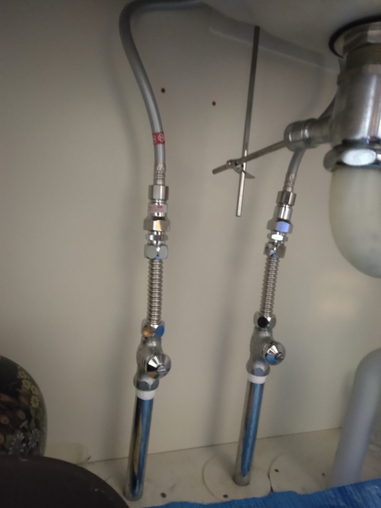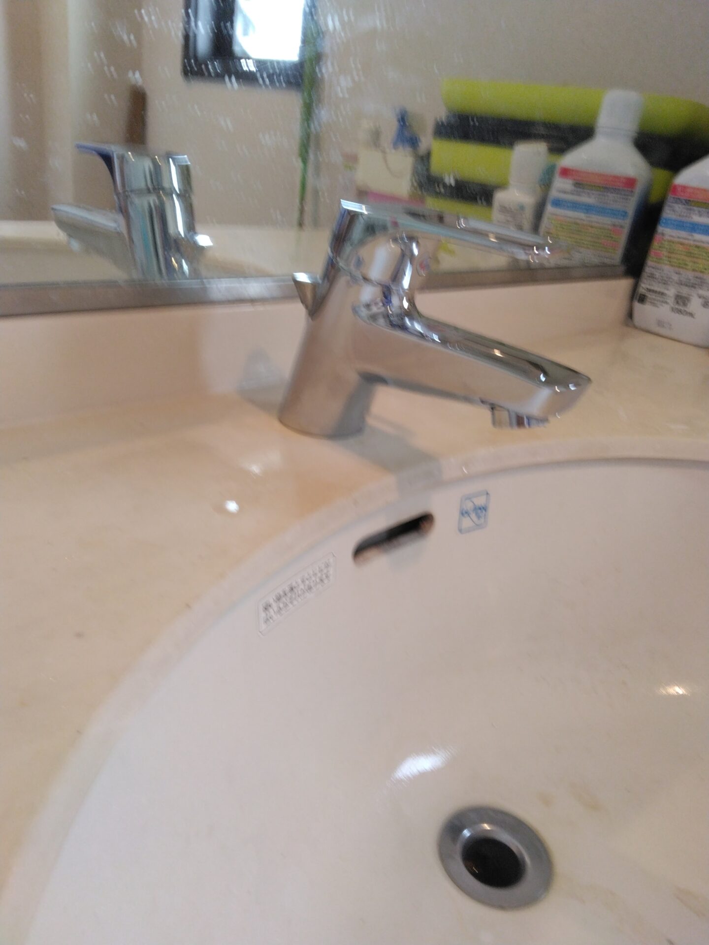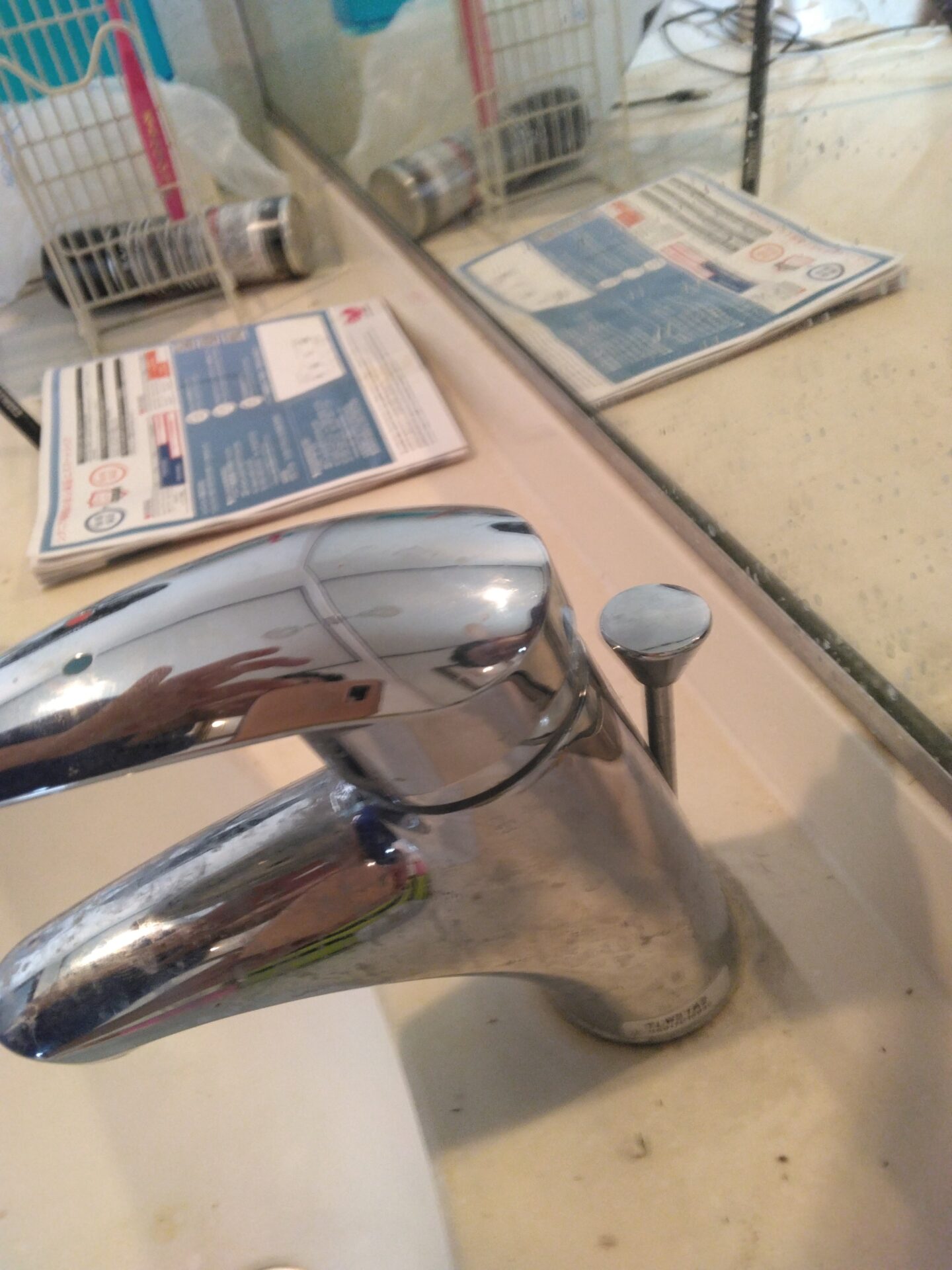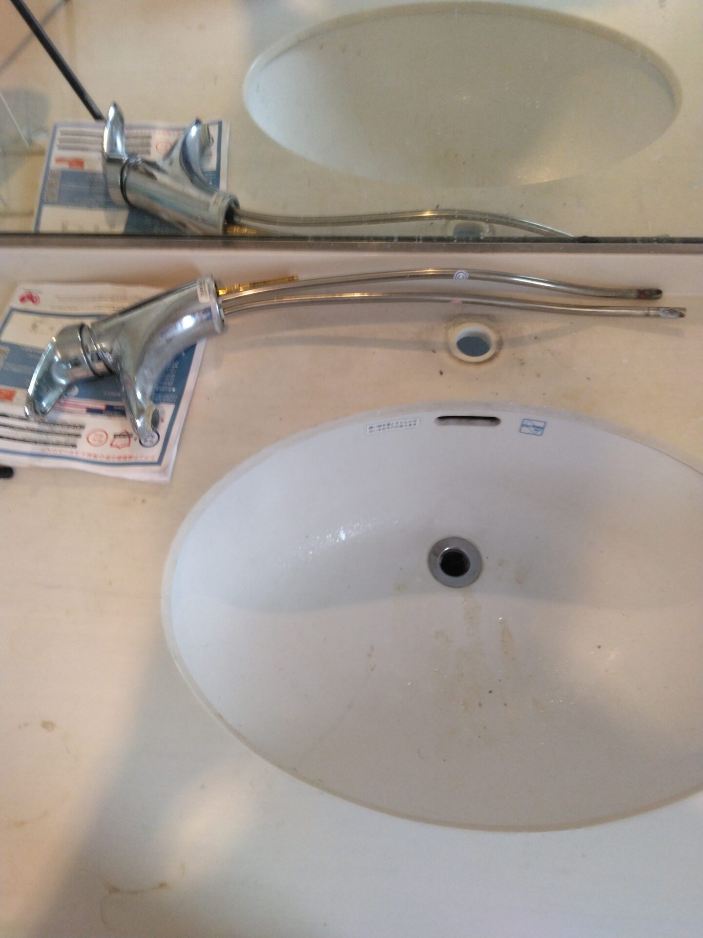 今回は洗面器の排水の部分と、水栓後部の引き棒を上下することによって排水栓が開閉するポップアップ式というタイプの水栓が付いているので、TOTOメーカーの後継機種にて交換を行いました。