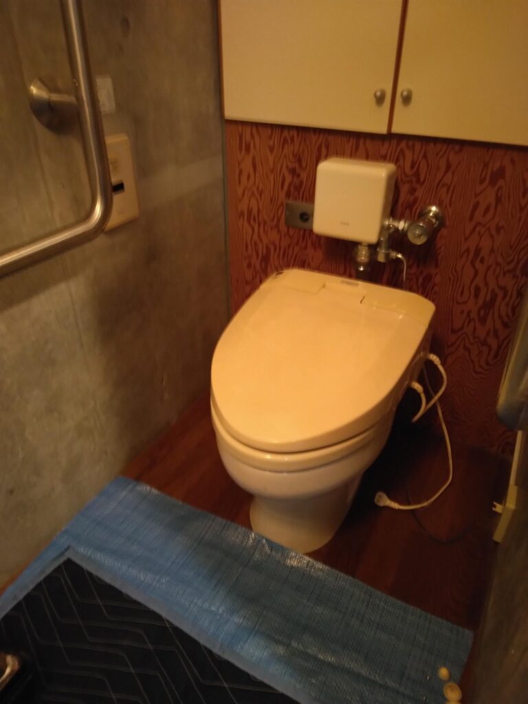 トイレの壁に埋め込まれたパネルに付いているセンサーとトイレの洗浄が連動しているタイプのおトイレですが、センサーが故障してしまい手動のみでの洗浄方法となっている状態との事でウォシュレットだけを交換するのではなく、トイレ一式毎の入れ替えをされたいとの事で、トイレの上の開き戸を今後も使用できるようにするためタンクレストイレの交換の提案をさせていただきました。