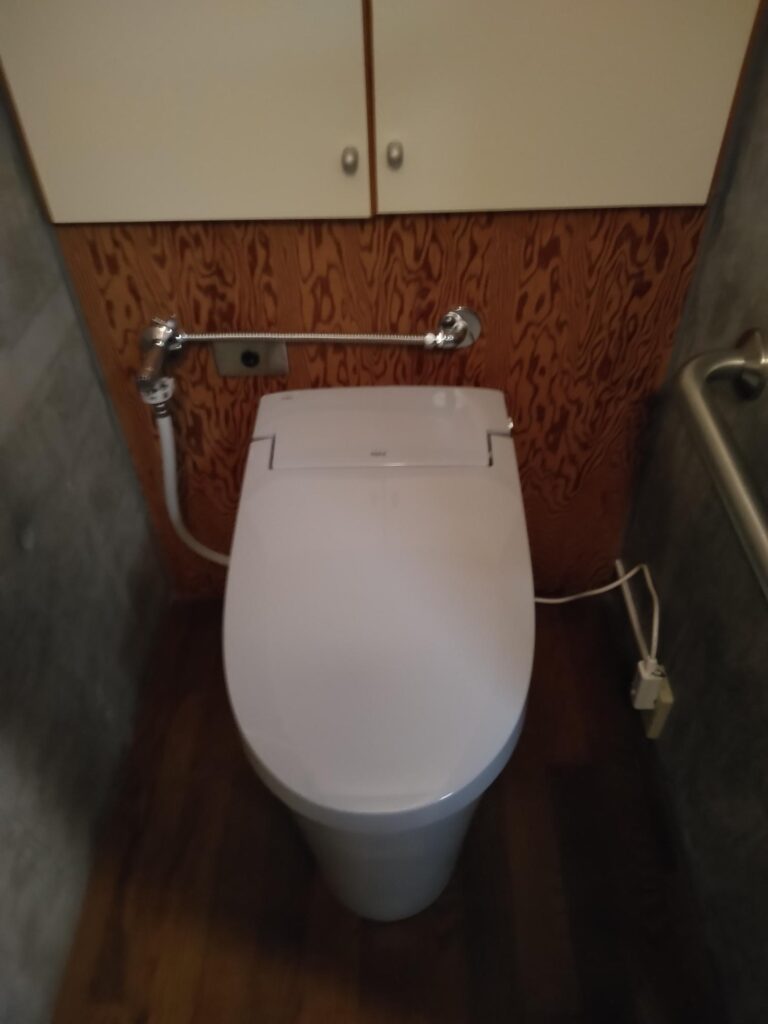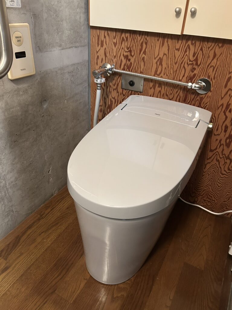 今回のお手洗いが床はフローリング、壁がコンクリートであったため、ご用意したブルーグレーのタンクレストイレがよりしっくりくる形で納まったのでお客様もお喜びになられておられました。