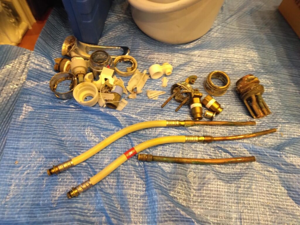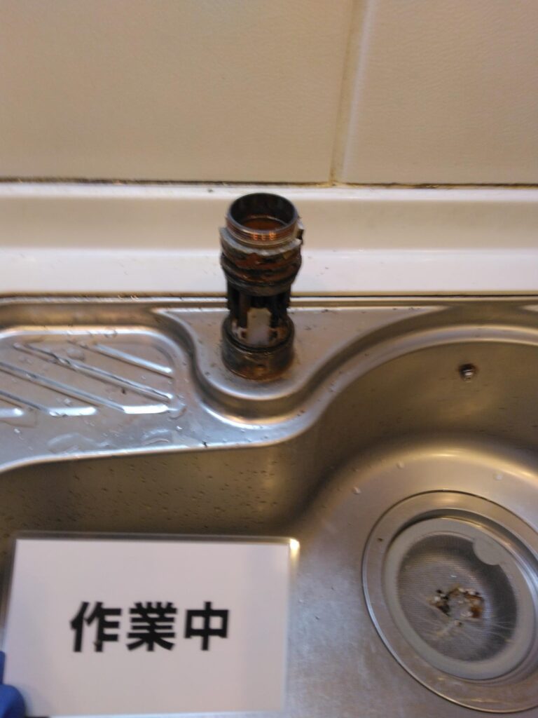 その翌日に作業を開始するとやはり漏水をした分水道水に含まれるカルシウムなどが固着し水栓がまともに取り外せない状態でしたので、剛材以外を分解をできるところまでして取外し残った部分を電動工具を使って切り落とす作業を行いました。