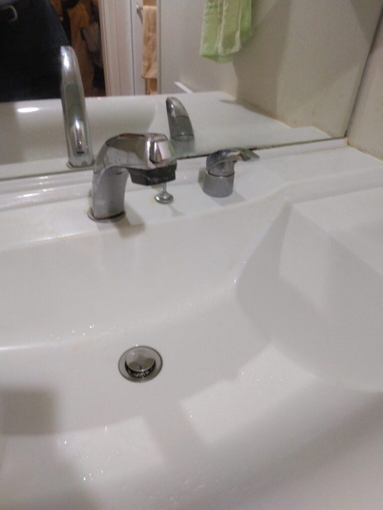 現行の水栓は約15年ほど使用されていて、商品自体に型式番号などが無く説明書なども無いという事で、お客様も洗面台が使えなくなるのは困るという事もあり、丁度社内在庫として同じ線の圧タイプの水栓があったのでその場でお取替えをさせて頂きました。