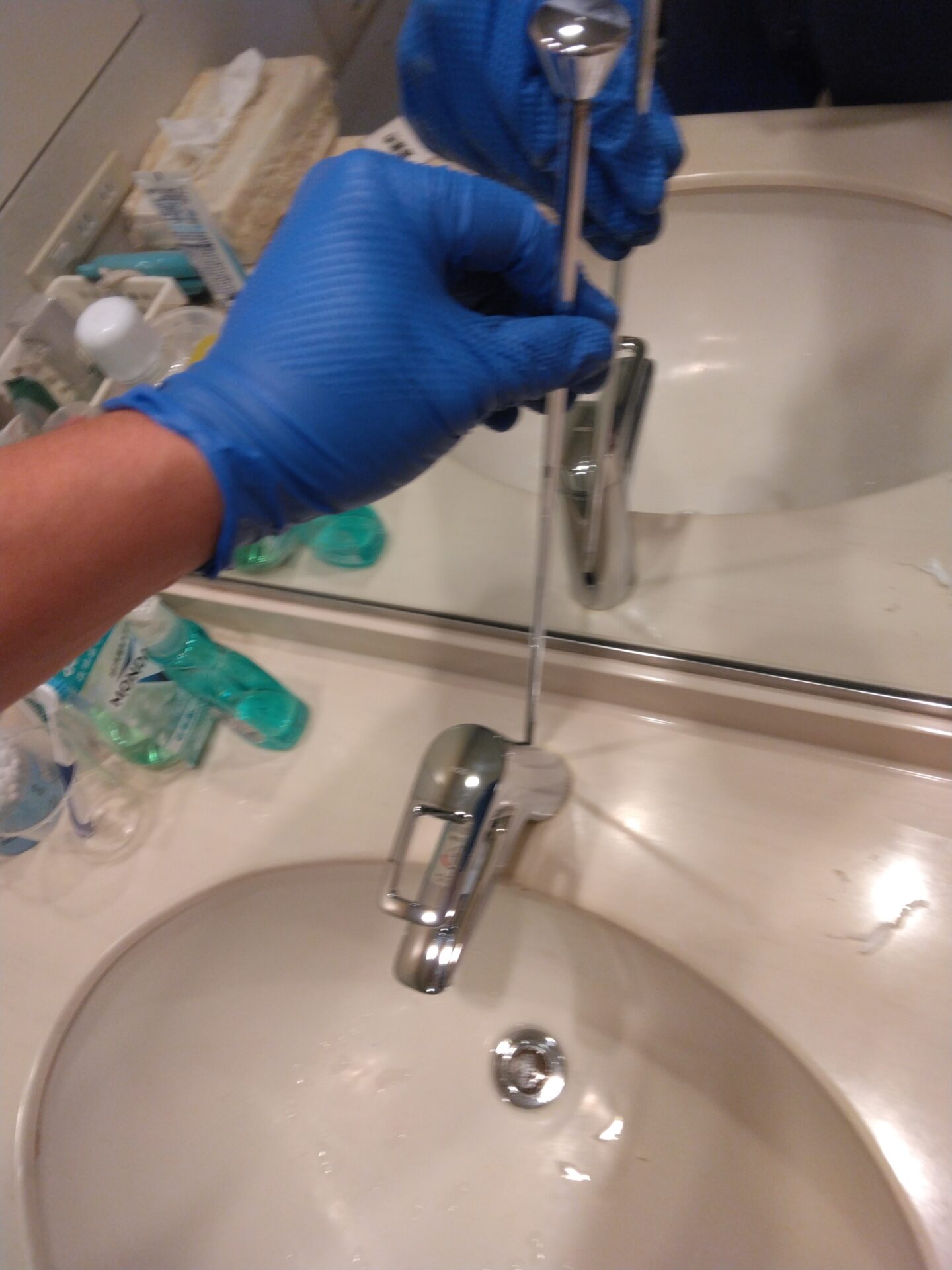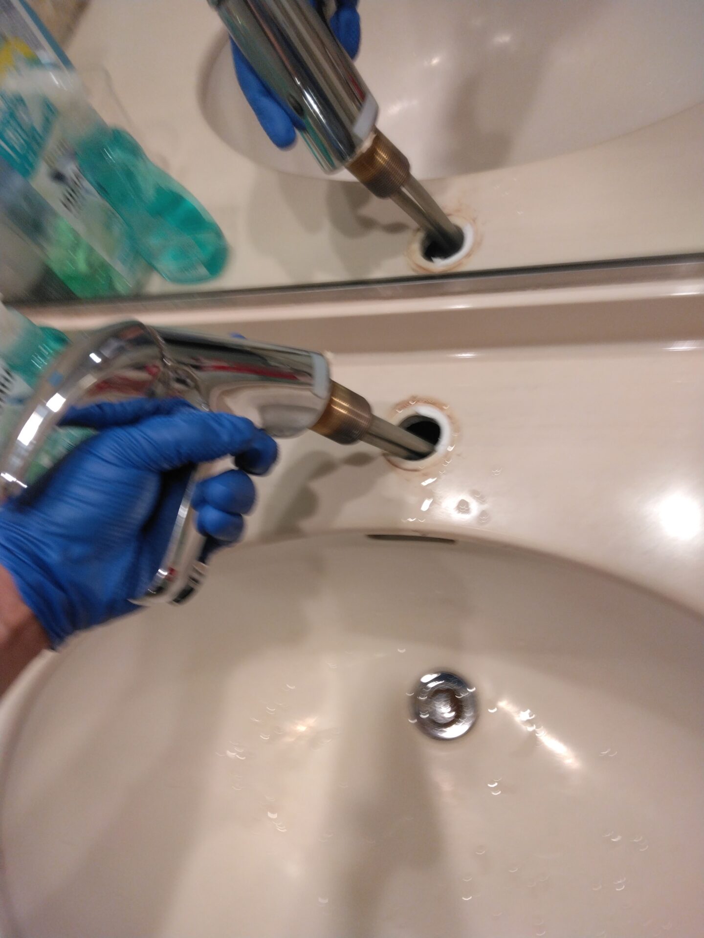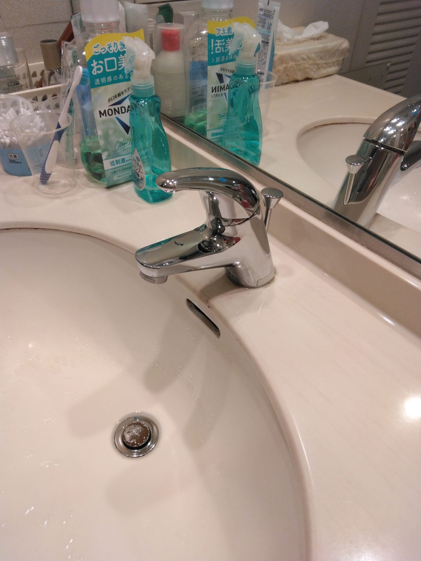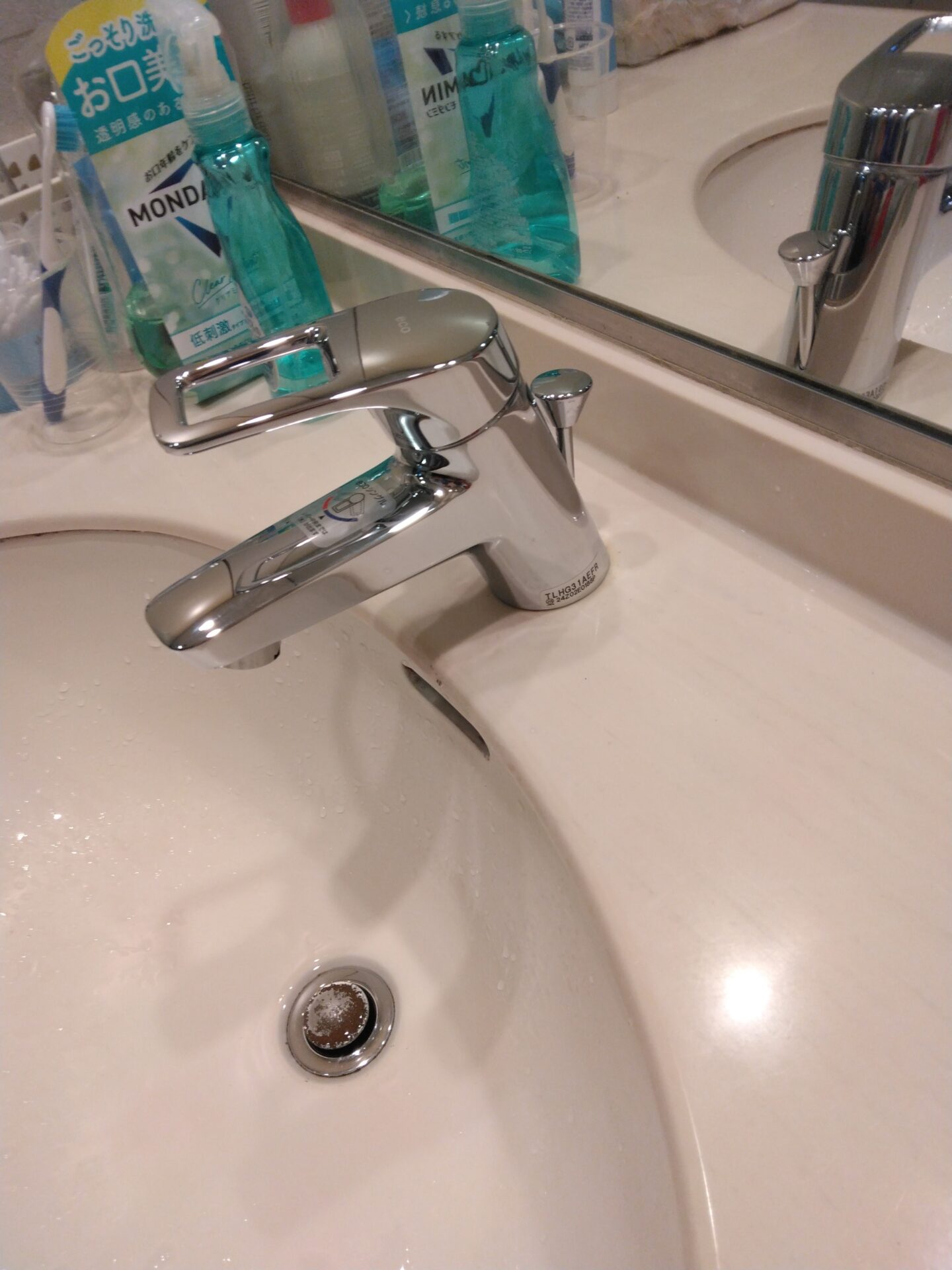 洗面器下の収納部を点検してみるとわずかに漏水の形跡がありましたが、水を流していても漏水せずその代わりに水を出す度に水栓本体からかなりのみずが漏れていたため、その水が隙間などから収納部へ漏水を起こしたのでは無いかと推測をし、今回は水栓本体の交換を行う事となりました。