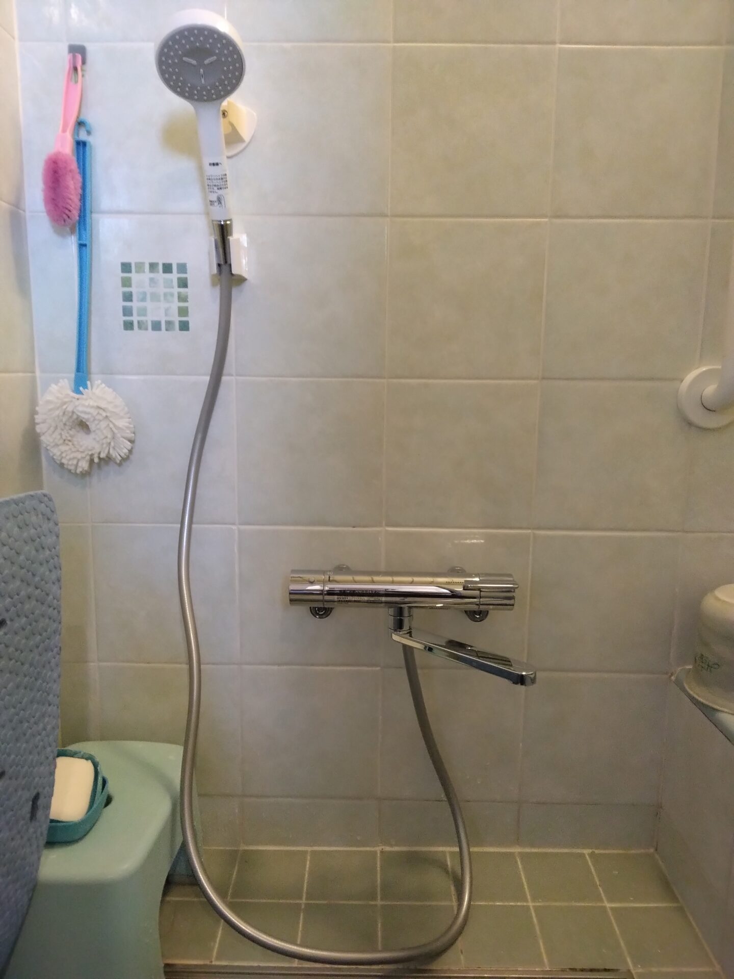ご訪問をし点検をしてみると、以前は入浴の際に介護が必要であったため水栓の高さをかさ上げした物が付いていて、シャワーホースの接続部からの漏水とお湯側のハンドルが堅くなり固着する、という症状がでていたため各部品の交換を行うか、現行品が2ハンドルの混合水栓のためサーモスタット式の混合水栓に水栓本体の交換を行うかでお見積りをさせて頂きました。