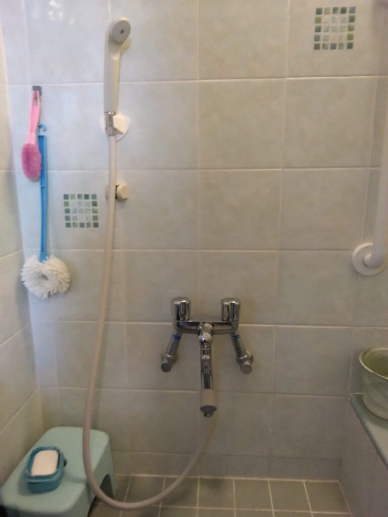 ご訪問をし点検をしてみると、以前は入浴の際に介護が必要であったため水栓の高さをかさ上げした物が付いていて、シャワーホースの接続部からの漏水とお湯側のハンドルが堅くなり固着する、という症状がでていたため各部品の交換を行うか、現行品が2ハンドルの混合水栓のためサーモスタット式の混合水栓に水栓本体の交換を行うかでお見積りをさせて頂きました。