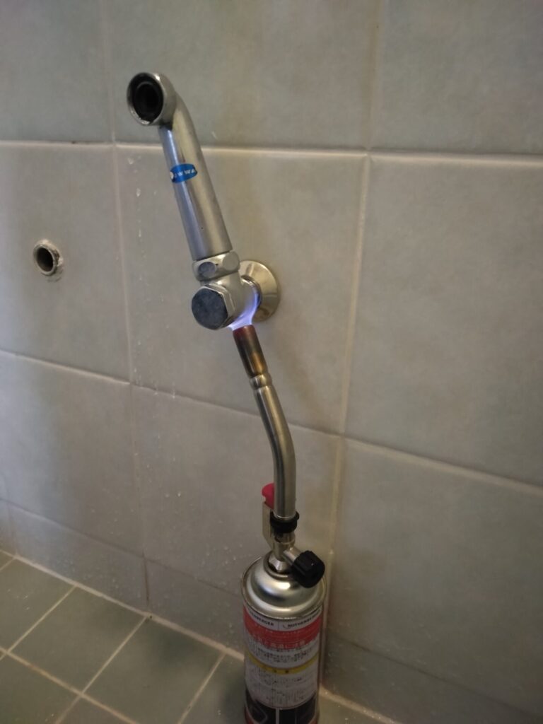 交換作業を行う際に、少し水栓の取り付け口の作りが古いため取外しの際に壁の中にある延長の継手が供回りをして一緒に外れないようにバーナーで少し炙りながら慎重に作業を行いました。