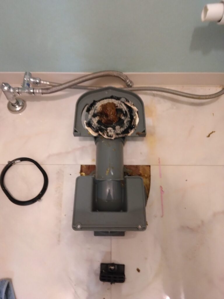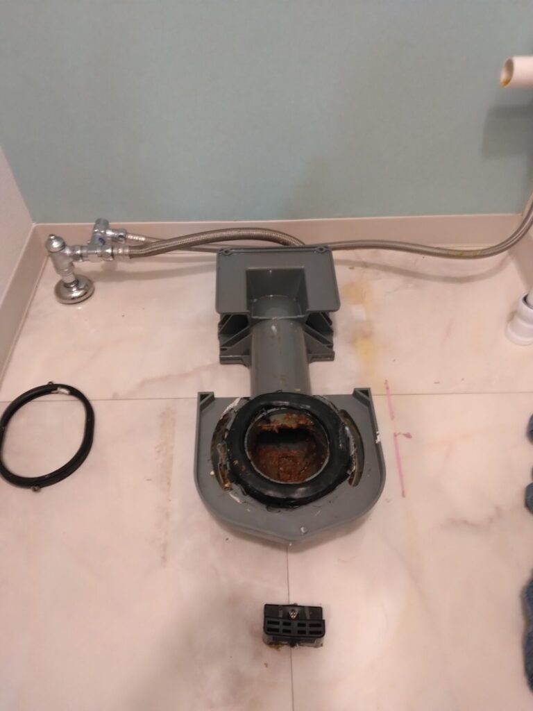今回は残念ながら以前よりも詰まりが強く、トイレを外す際にもかなり汚水も出てしまい外して排水アジャスターに機材を当てても通管できなかった為に、更にアジャスターの脱着を行い便を除去しフランジパッキンの交換も行いトイレを戻して詰まりは改善となりました。